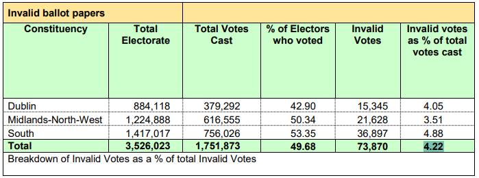 “Is mór an t-údar díomá méid na vótaí millte agus neamhbhailí a fheiceáil – is líon ollmhór é 108,000 mar gheall ar an gcaoi a n-oibríonn ár gcóras toghcháin; i gcás go leor de na toghcháin thiocfadh leis na vótaí sin an difear idir suíochán a bhuachan agus a chailliúint a dhéanamh.