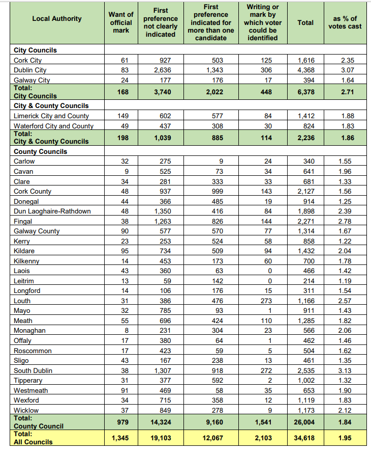 As na vótaí millte sna toghcháin Eorpacha agus áitiúla in 2019, léiríonn an fhianaise nár comhaireadh 34,618 de na vótaí sna toghcháin áitiúla, agus nár comhaireadh 73,870 sna toghcháin Eorpacha a bhí ar siúl ar an lá céanna.